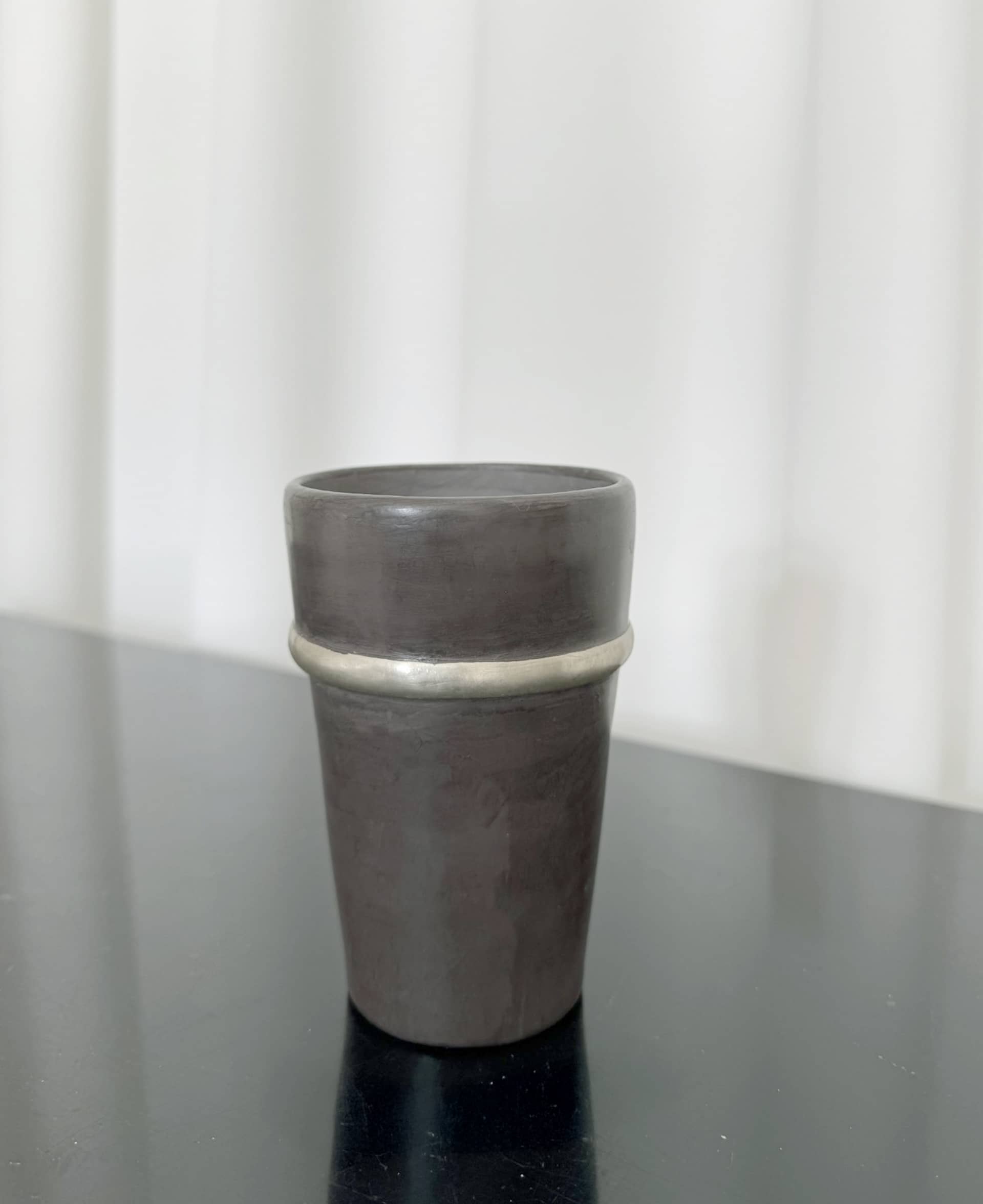 A minimal ceramic cup in a dark pewter glaze with white gold band finishes, Moroccan, Contemporary.