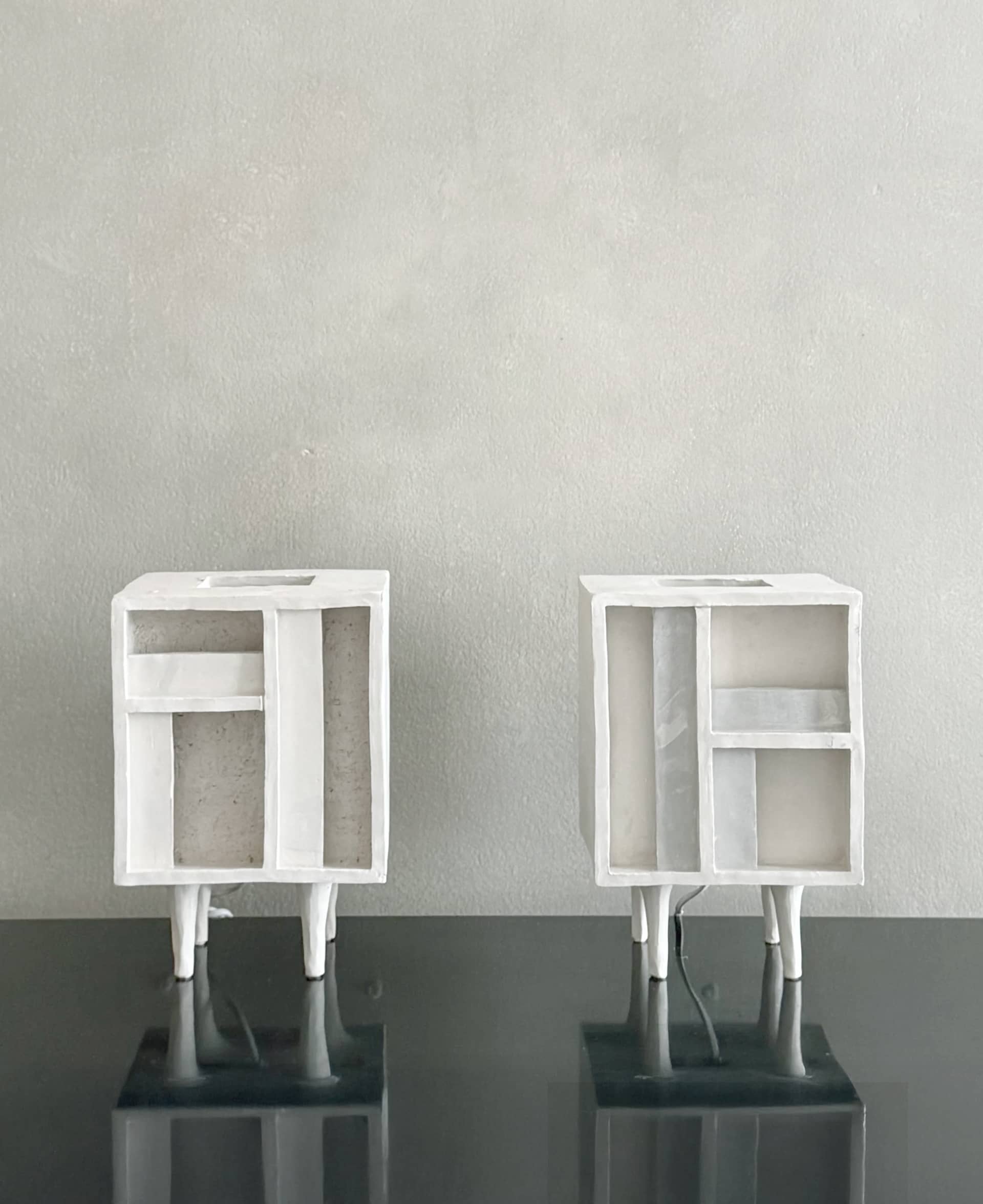 A pair of double-sided Mondrian-esque white cube table lamps, France 1960.